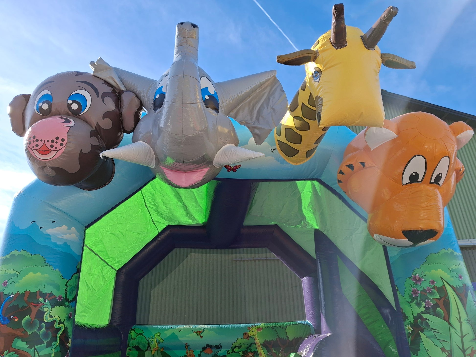 Hop løs sammen med elefanten, giraffen, løven og den glade abe i denne farverige og dyrefyldte hoppeborg! Junglebounce er perfekt til børn, der elsker dyr og masser af bevægelse. En sjov og livlig hoppeborg, der skaber smil og energi til enhver børnefest.