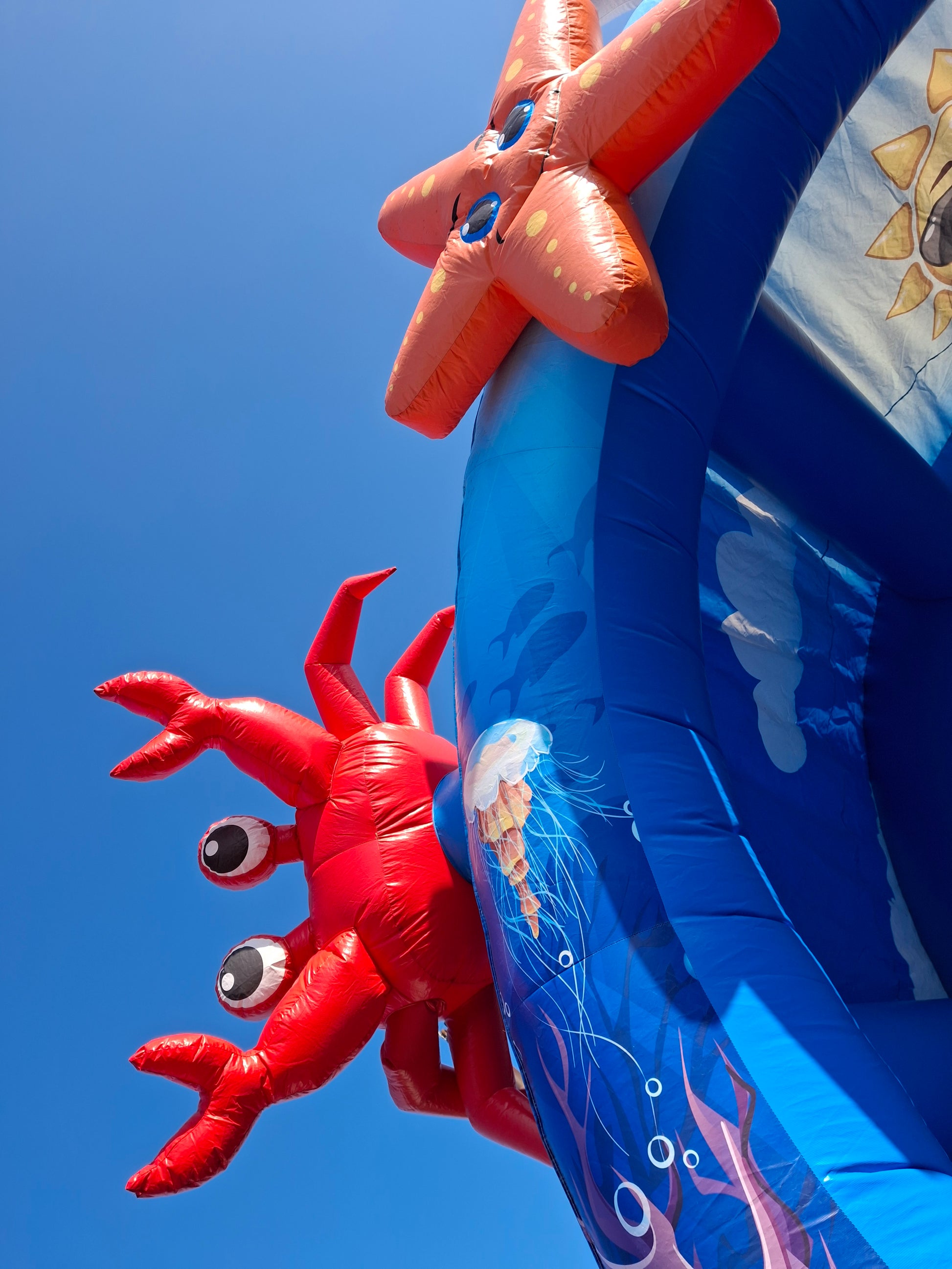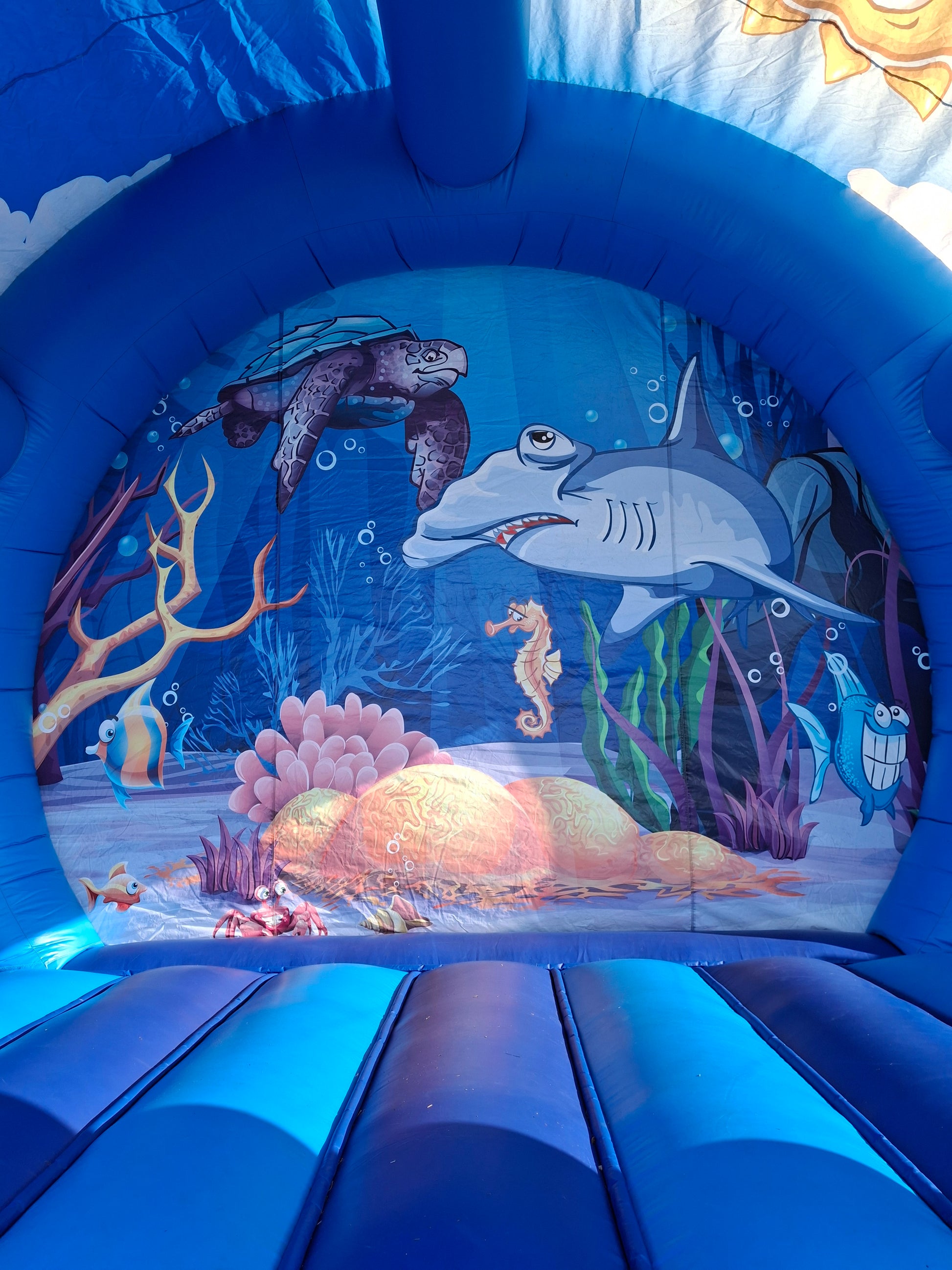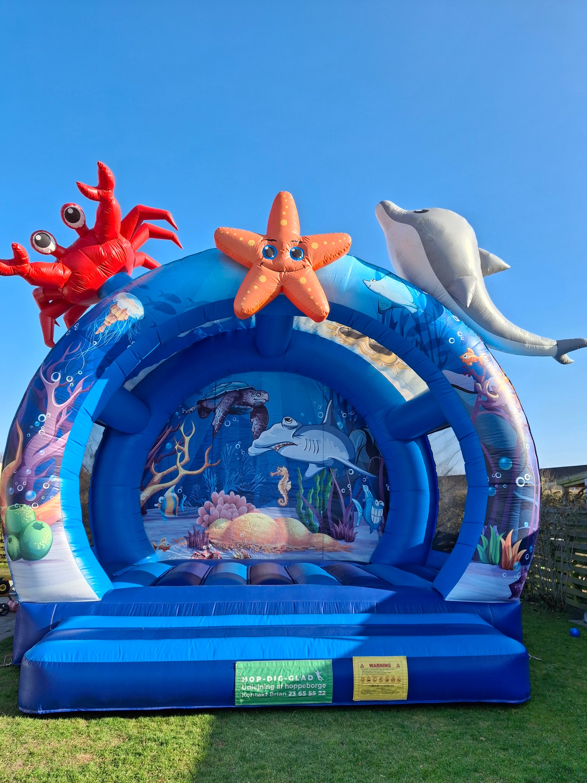 Træd ned under havets overflade med denne farverige undervandstema-hoppeborg, pyntet med en søstjerne, delfin og krabbe. Perfekt til børnefødselsdage og events, hvor fantasien får frit spil og børnene kan hoppe løs i timevis.